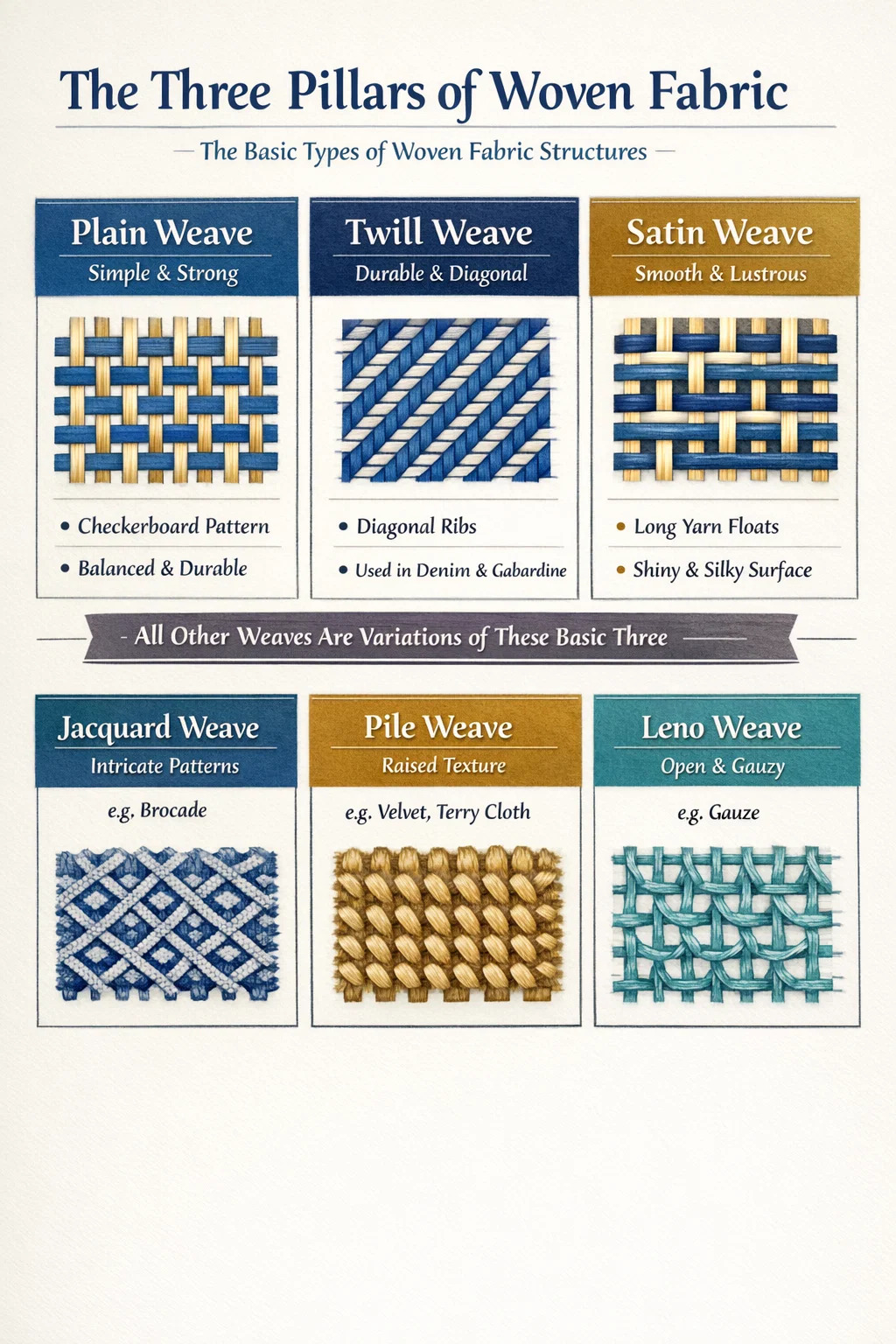 Deși există sute de nume de piață specifice pentru textile, există din punct de vedere tehnic trei tipuri fundamentale de țesătură structuri din care derivă aproape toate celelalte: Țesătură simplă, țesătură twillă și țesătură din satin . Orice altă variație, cum ar fi țesăturile Jacquard, Dobby sau grămadă, este o modificare complexă a acestor trei modele de întrețesere de bază. Înțelegerea acestor categorii este esențială pentru a identifica durabilitatea, draperiile și utilitatea oricărui produs textil.