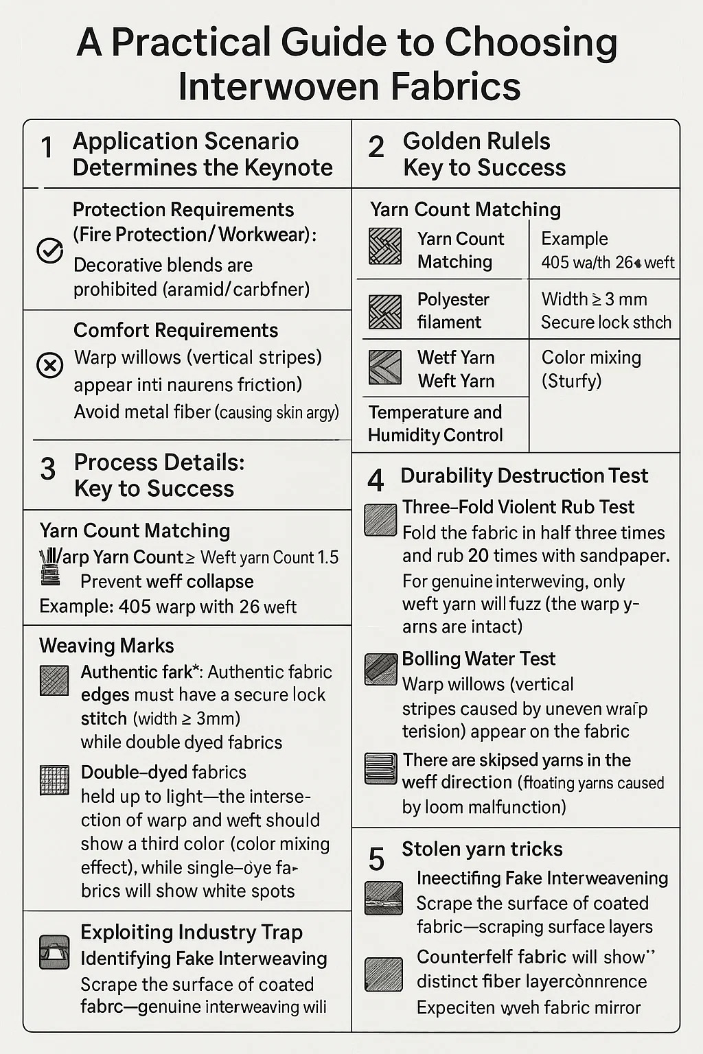 Cerințe de protecție (protecție împotriva incendiilor/îmbrăcăminte de lucru): Firele de urzeală trebuie să fie fibre de înaltă rezistență (aramidă/fibră de carbon). Amestecuri decorative sunt interzise (nivel de protecție redus).