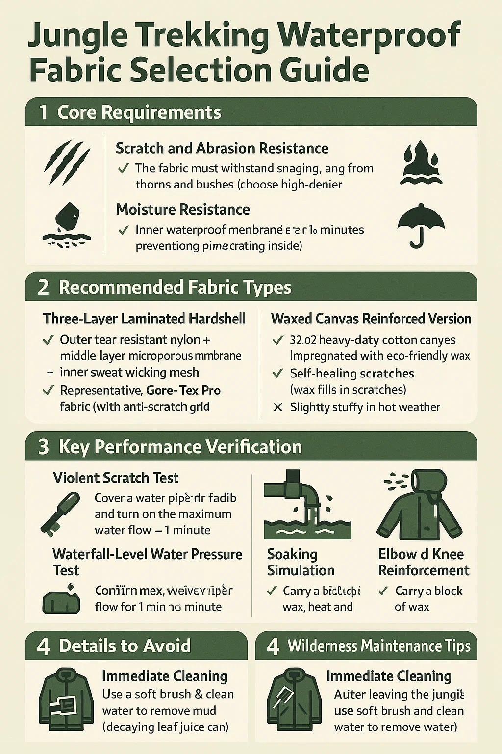 Rezistență la zgârieturi și abraziune: țesătura trebuie să reziste la strângerea și ruperea din cauza spinilor și a tufișurilor (alegeți nailon cu denier înalt cu o textură de suprafață asemănătoare pietrișului).