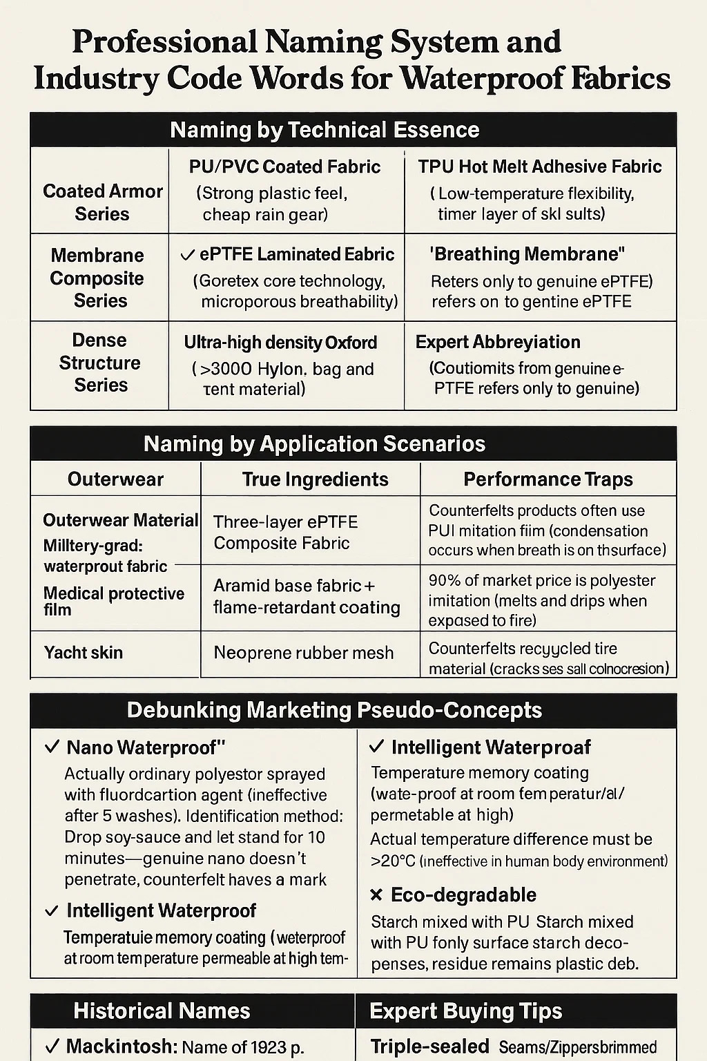 "Nano Waterproof": Poliester obișnuit de fapt pulverizat cu agent fluorocarbon (ineficient după 5 spălări). Metoda de identificare: Drop sos de soia. Metoda de identificare: Aruncați sosul de soia și lăsați să stea timp de 10 minute — nano autentic nu pătrunde, contrafăcutul lasă urme.