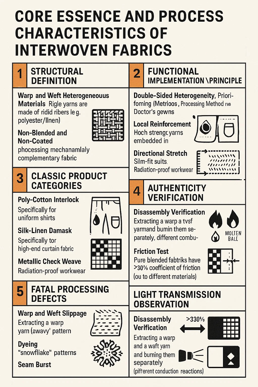 Materiale eterogene de urzeală și bătătură: firele de urzeală sunt realizate din fibre rigide (de exemplu, poliester/in), în timp ce firele de bătătură sunt realizate din fibre flexibile (de exemplu, bumbac/vâscoză), creând o țesătură complementară mecanic.