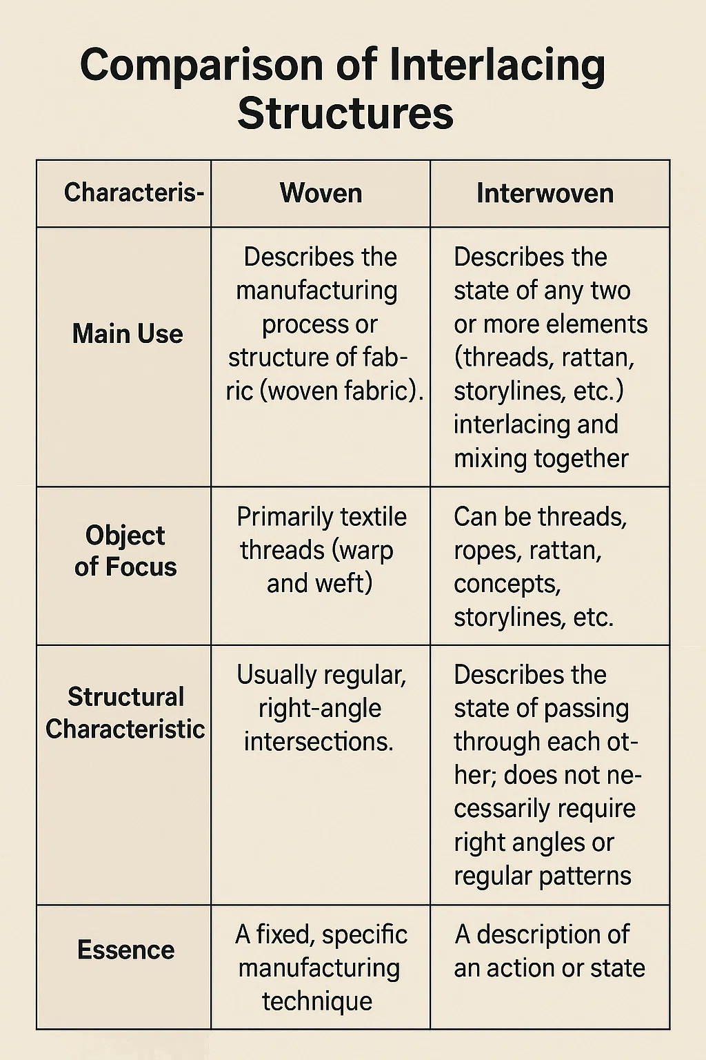 | Utilizare primară | Descrie procesul specific de fabricație sau structura finită a textilelor (țesătură). | Descrie starea în care două sau mai multe seturi de elemente (fire, trestie, povești etc.) sunt încrucișate sau amestecate. |