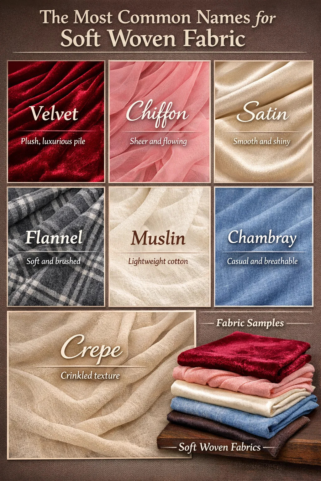 Când oamenii întreabă „cum se numește țesătura moale”, răspunsul depinde de conținutul de fibre, structura țesăturii și finisajul. Cele mai recunoscute țesături moi includ catifea, sifon, satin, muselina, flanel, cambray si crep . Fiecare dintre acestea este produsă pe un țesut de țesut folosind fire întrețesute, dar se simt complet diferite unele de altele datorită modului în care firele sunt aranjate, răsucite sau finisate după țesere.