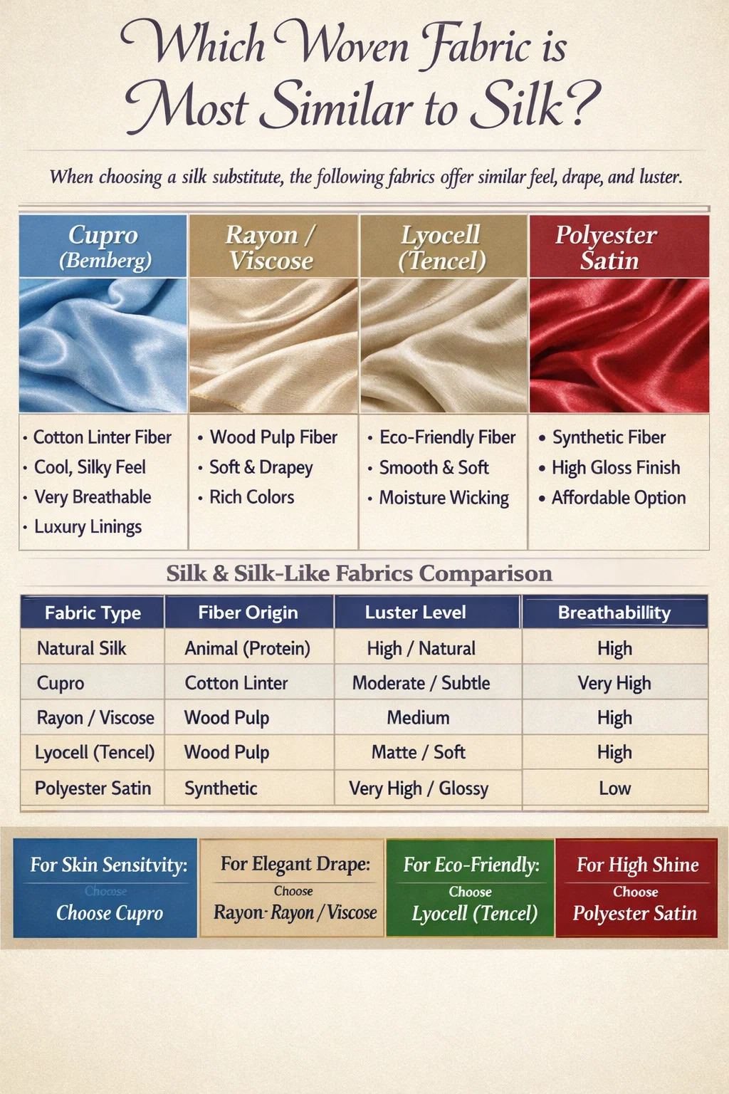 Când căutați a țesătură care reproduce senzația de lux, strălucirea și drapajul mătăsii naturale, cei mai importanți concurenți sunt Rayon, Cupro și Lyocell (Tencel) . Printre acestea, Cupro este considerat cel mai apropiat meci în ceea ce privește respirabilitatea și atingerea mătăsoasă, în timp ce Poliester cu țesătură satinată servește drept cea mai comună alternativă sintetică la prețuri accesibile. Aceste țesături folosesc specific ţesut tehnici de imitare a fibrelor proteice netede produse de viermii de mătase.